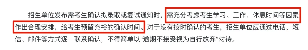 对于没有按时确认的考生,招生单位应通过电话、短信、邮件等方式逐一联系确认,不得简单以“逾期不接受视为自行放弃”对待。”