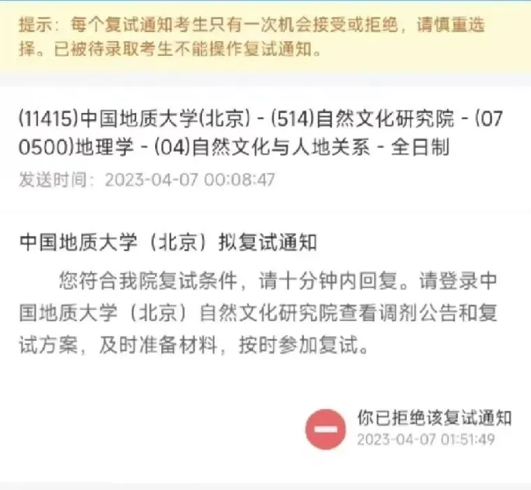 当天复试当天就给结果。学生必须在两小时内纠结是等待理想院校的复试通知还是确认此院校的拟录取结果。