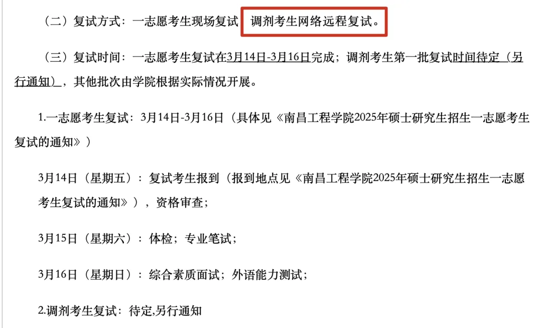 如南昌工程学院在2025年硕士研究生复试工作方案中提到复试方式:一志愿考生现场复试,调剂考生网络远程复试。