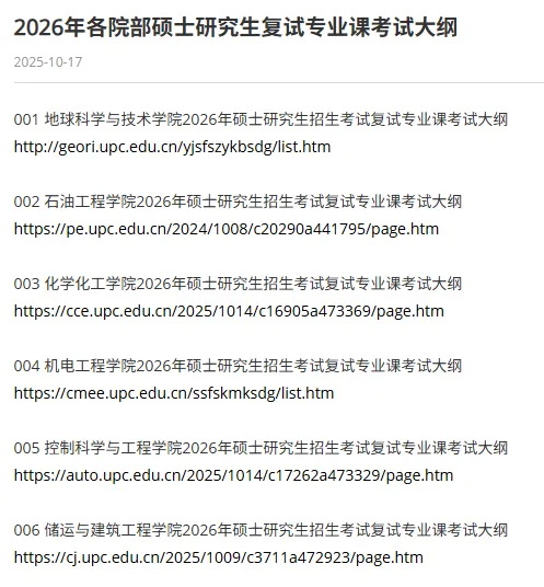 中国石油大学发布了2026年各院部硕士研究生复试专业课考试大纲。