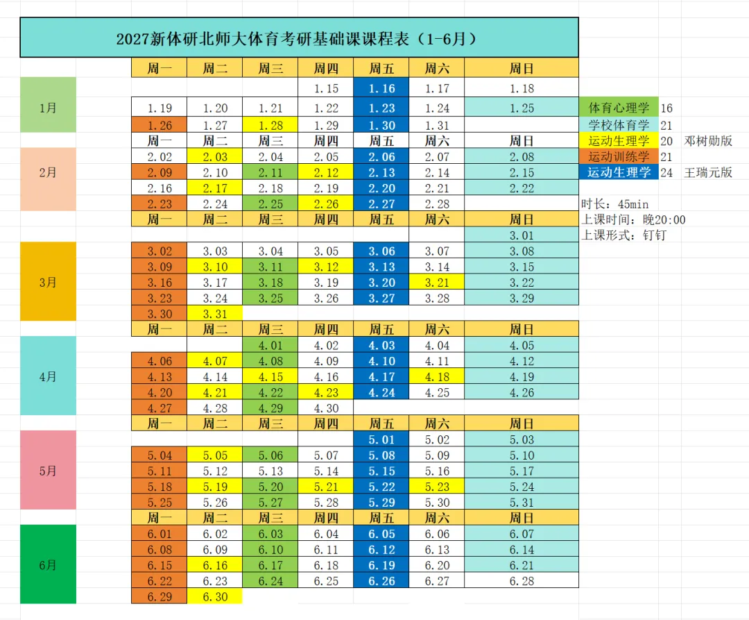 各位备战北师大体育考研的准研究er注意啦!2027 级体育考研初试基础班课表正式发布,1-6 月的备考节奏、课程安排全给你们理得明明白白,赶紧码住!