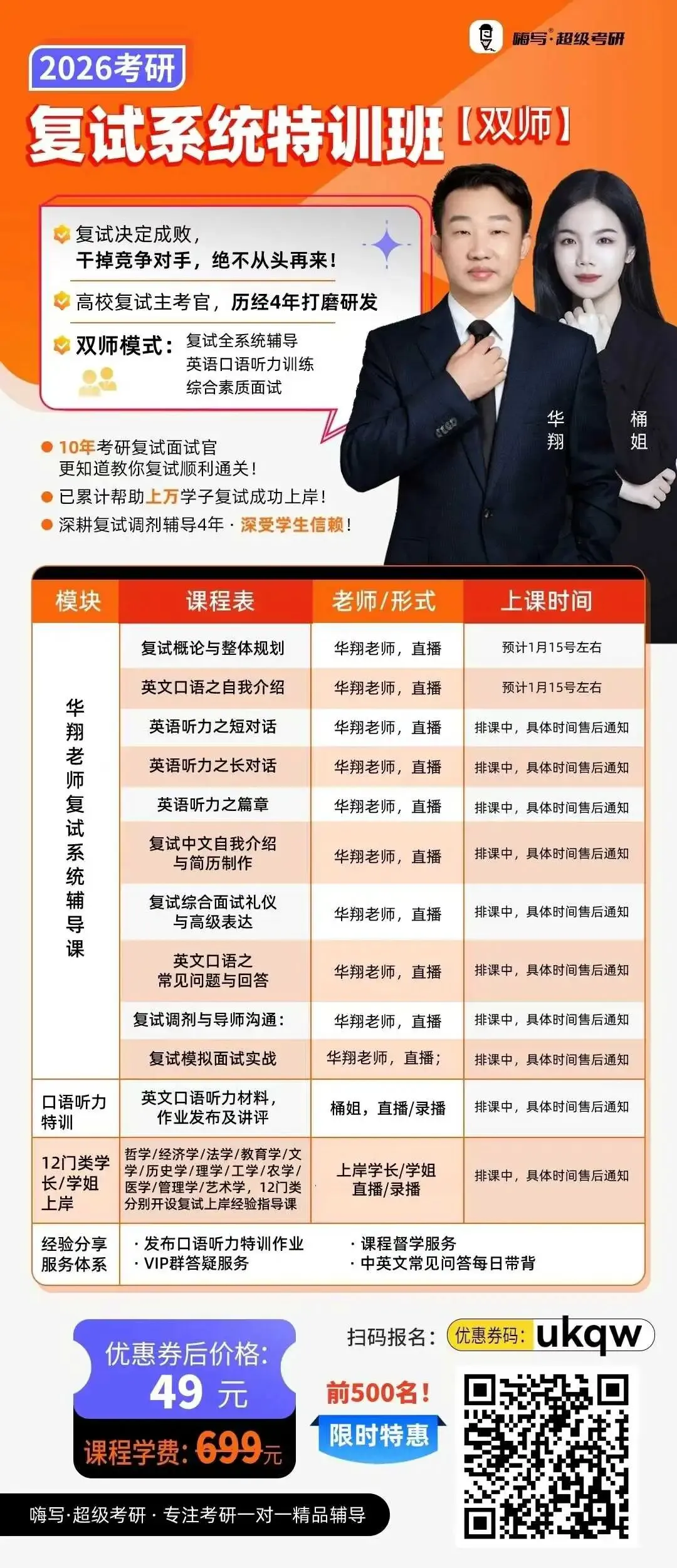 - 用一杯奶茶钱,拿下双师课 + 口语听力特训作业+VIP群答疑服务+课程督学服务+中英文常见问答每日带背,扫码输优惠券码「ukqw」直接锁名额!最后:这一年的熬夜刷题,都是为了 “上岸” 这两个字。查分只是节点,现在启动复试准备,才能在2月出分后更从容