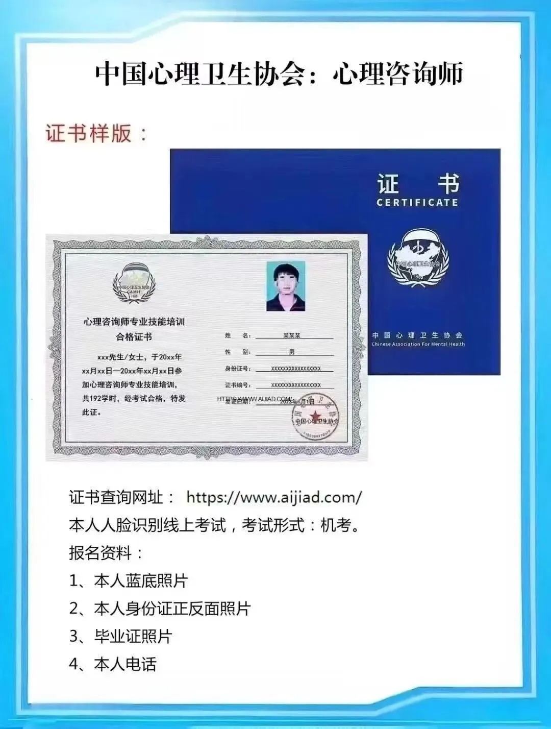 在快节奏的现代社会中,焦虑、抑郁、关系危机、职场压力等心理健康问题日益突出,人们对心理健康服务的需求正以前所未有的速度增长。与此同时,国家政策持续推动精神卫生体系建设,“身心健康”成为全民共识,这意味着心理咨询行业正迎来前所未有的发展机遇。然而,面对如此庞大的需求,市场真正缺乏的,是具备专业资质、扎实医学与心理学知识、正规系统培训背景的心理咨询师。🏛️ 为什么选择“中国心理卫生协会”的认证?——源于行业最权威的声音中国心理卫生协会(CAMH),成立于1985年,是国家一级行业协会,也是国内精神卫生与心理健康领域最权威、最具影响力的行业管理组织。其背景和专业性,值得信赖:✅ 原人社部心理咨询师职业资格考试的技术支持与命题单位✅ 组织编写原国家心理咨询师培训教程,拥有最系统的学科积累与教学资源✅ 拥有近300门专业课程,培养心理学人才近10万名✅ 由长期从事心理咨询培训与鉴定的权威专家团队全程支持选择中国心理卫生协会,就是选择专业、系统、权威的心理学成长路径。📈 为什么现在必须学习心理咨询?——三大理由告诉你答案随着心理健康意识普及,学校、企业、社区、医院、司法系统等领域对心理咨询师的需求激增。据预测,我国专业心理咨询师缺口达数十万人,且持续扩大。现代心理问题往往与生理健康交织。具备医学背景或系统医学心理学知识的咨询师,更能科学评估、系统干预,成为行业急需的复合型专业人才。考试及学习形式:线上学习+培训教材+练习题库+本人人脸识别线上机考,严谨规范1.心理学、医学、教育、社工等相关专业学生或从业者;4.对心理学有浓厚兴趣,希望系统学习的爱好者✨ 学习心理咨询,不仅是一张证书,更是一种能力、一份责任、一个未来。5.在情绪疾病成为“时代病”的今天,你不仅可以自救,更能助人。掌握心理学专业知识,成为那个在他人迷茫时点亮一盏灯的人。📌 报名资料仅需:蓝底照片、身份证、毕业证、联系电话即可开启学习之旅。🔍 证书查询官网:https://www.aijiad.com/中国心理卫生协会 · 专业培训 · 权威认证 · 系统培养为你的专业之路,提供最坚实的起点。培训班报名、拜师服务、传承工作室建设
