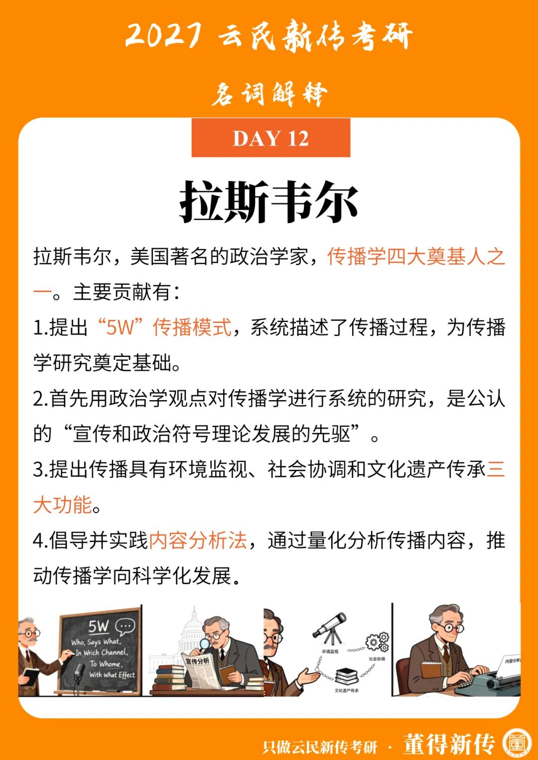 1.提出“5W”传播模式,系统描述了传播过程,为传播学研究奠定基础。