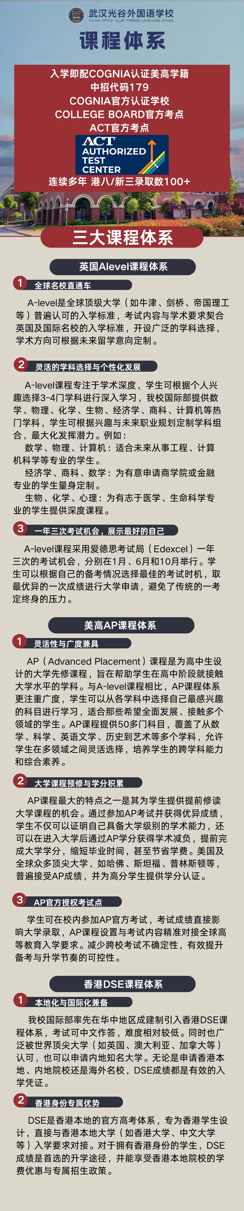 我们深知,越来越多的家庭正在回归理性,希望找到一条清晰、踏实、可期待的升学路径。正因为理解这份期待,光谷外国语学校国际部选择用专注来回应——我们不仅仅引入课程,更希望成为陪伴者与引路人,帮助那些向往香港、新加坡、以及美英澳加等地顶尖高校的学子,一步步走向理想的学府。