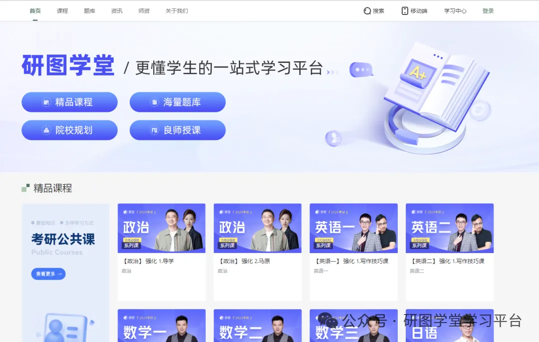 研图学堂学习平台目前由考研公共课、考研专业课、考研院校规划课程、英语四六级和教资五个课程部分组成。