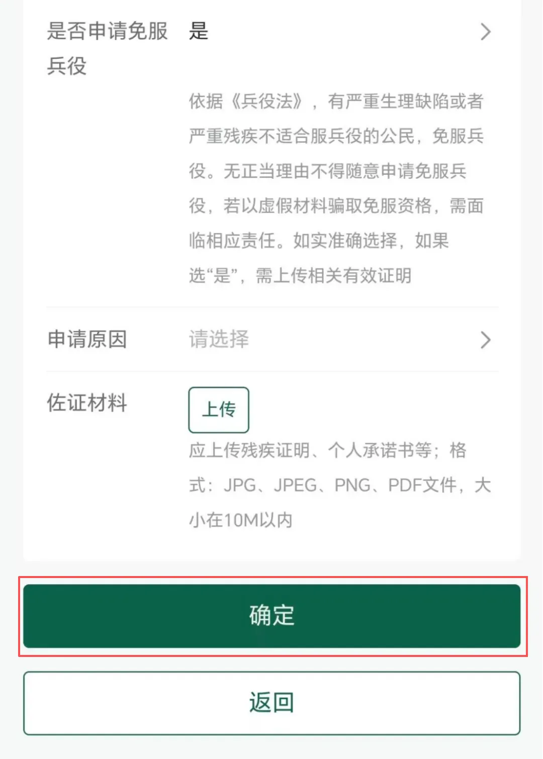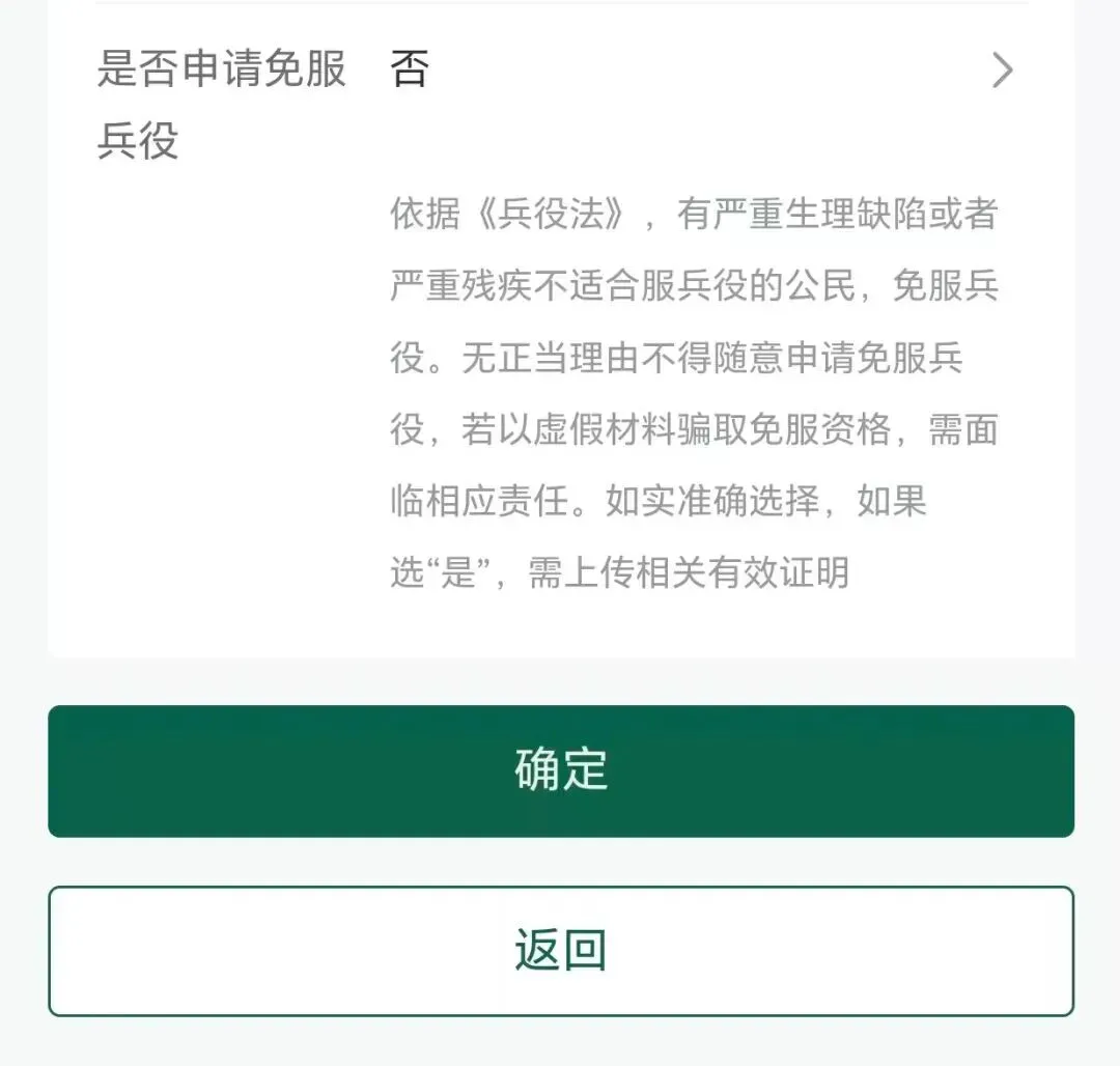 第十一步 最后就是2026年新增的一项内容——“是否申请免服兵役”,如果身体健康的填“否”,就是符合服兵役条件,当然并不是你选“否”就等于报名参军了,只是说明你具备服兵役的身体条件,兵役机关不会强制你去报名参军。如果本人有服兵役的想法,还需要在“义务兵征集”菜单里继续申请才可以参加义务兵报名。