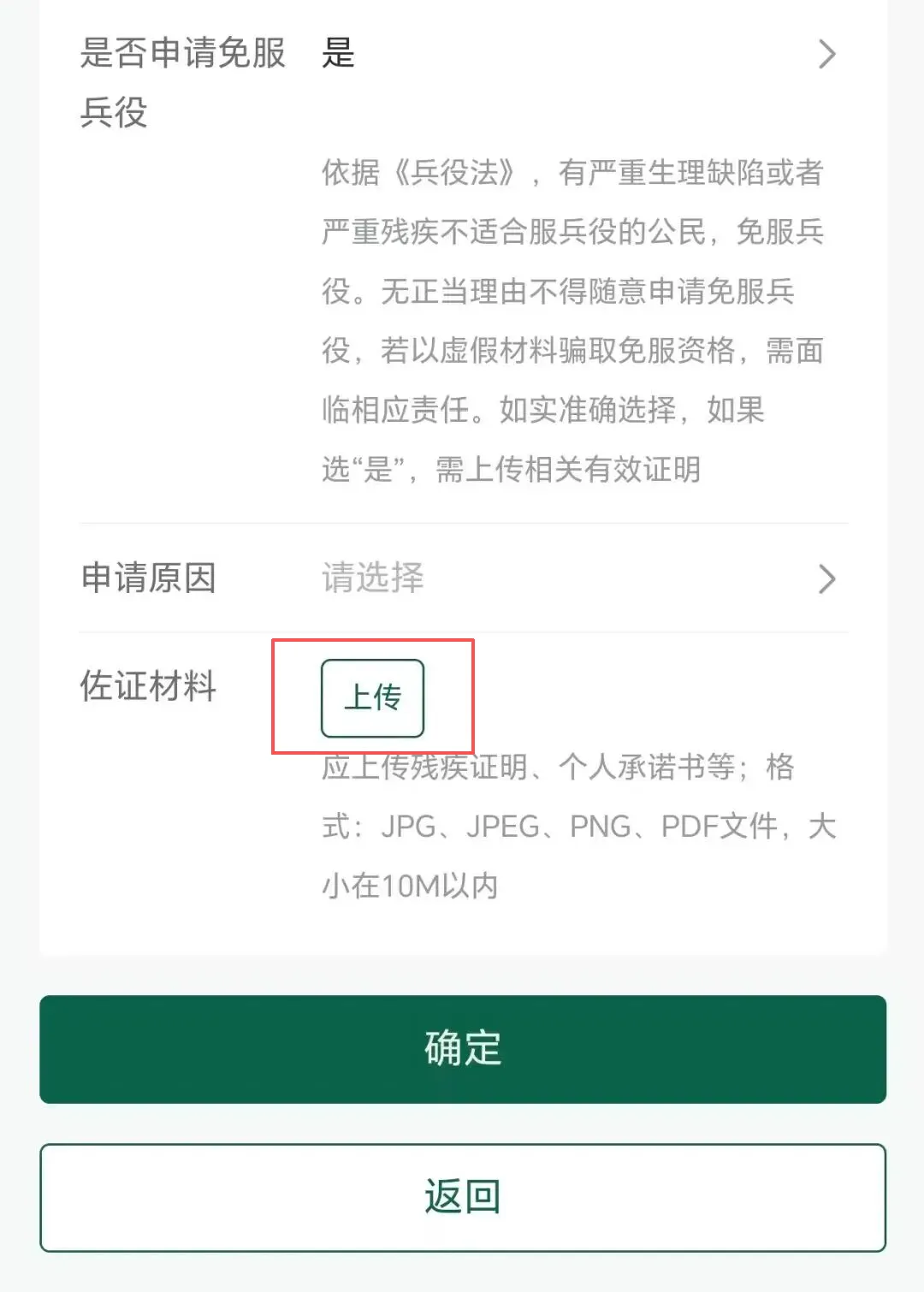 郑重提醒:在申请原因里选择下图中的伤残等级或者残废等级(最新兵役登记工作规定最新官宣! 12月15日发布《兵役登记工作规定》明确:政府有关部门对依照法律被剥夺政治权利的公民,应当作出不得服兵役的结论;对被鉴定为一级至四级伤残或者完全丧失劳动能力,或者被评定为一级至三级残疾等级的公民,应当作出免服兵役的结论)。如有下面的身体情况请按相应级别填写,当然必须上传“佐证材料”(附个人承诺书模板征兵网改版后,《申请免服兵役伤残个人承诺书》模版!)