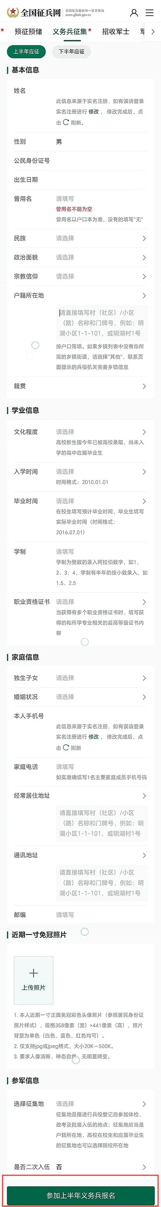 第四步 按要求填写信息,填写时一定要看后面注明的相关要求,最后在下面选择“参加上半年义务兵报名”