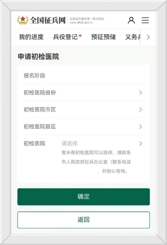 第五步申请初检医院,在乡镇武装部指导下填写卫生院即可