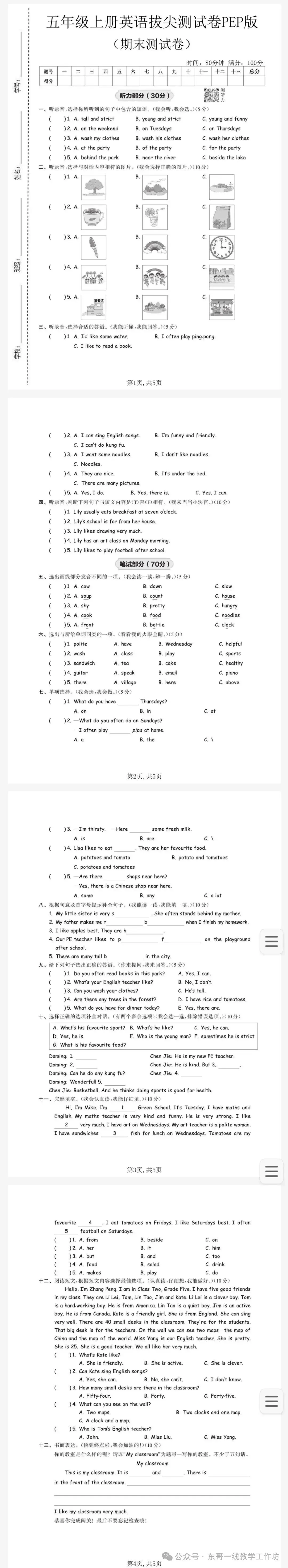 >人教版五年级上学期英语期末考试卷(三)