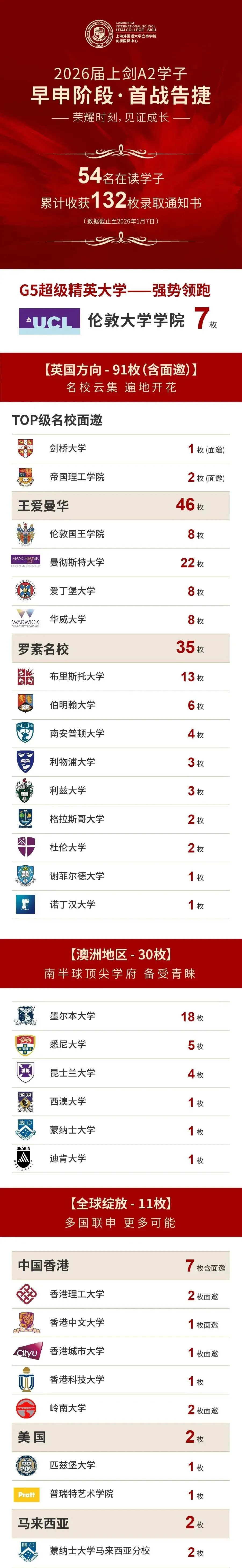 上外立泰剑桥第九届毕业生,也就是2025届毕业生,85%的同学收获QS前100院校Offer,包括了12枚UCL、1枚NYU、1枚南加大、1枚港大,人均手握4-5封录取。