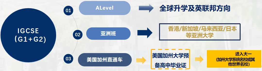 学生根据A-Level课程、美国加州预备课程、亚洲班课程的学习直接申请英、美、澳、加、中国香港、新加坡、马来西亚、日本等地的知名高校。