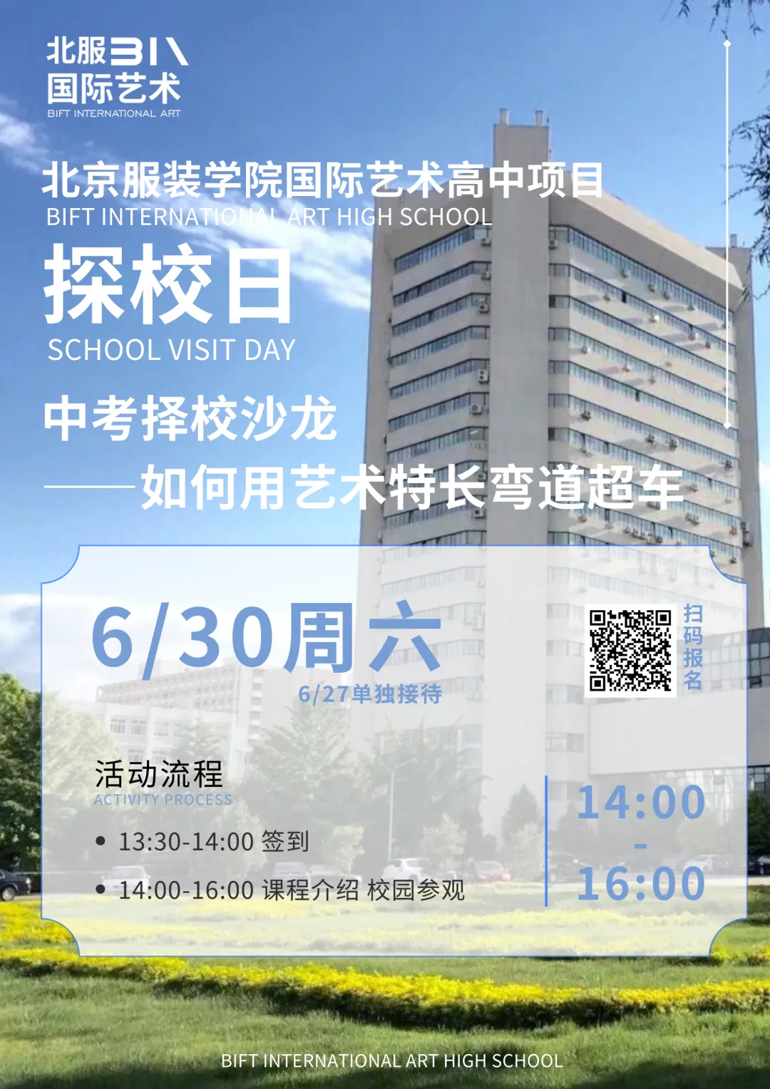 北京服装学院国际艺术高中课程项目新一轮探校日已经开启,欢迎家长和同学到校参观。预约探校请扫描下方海报二维码填写报名表,提交后招生老师会与您联系。