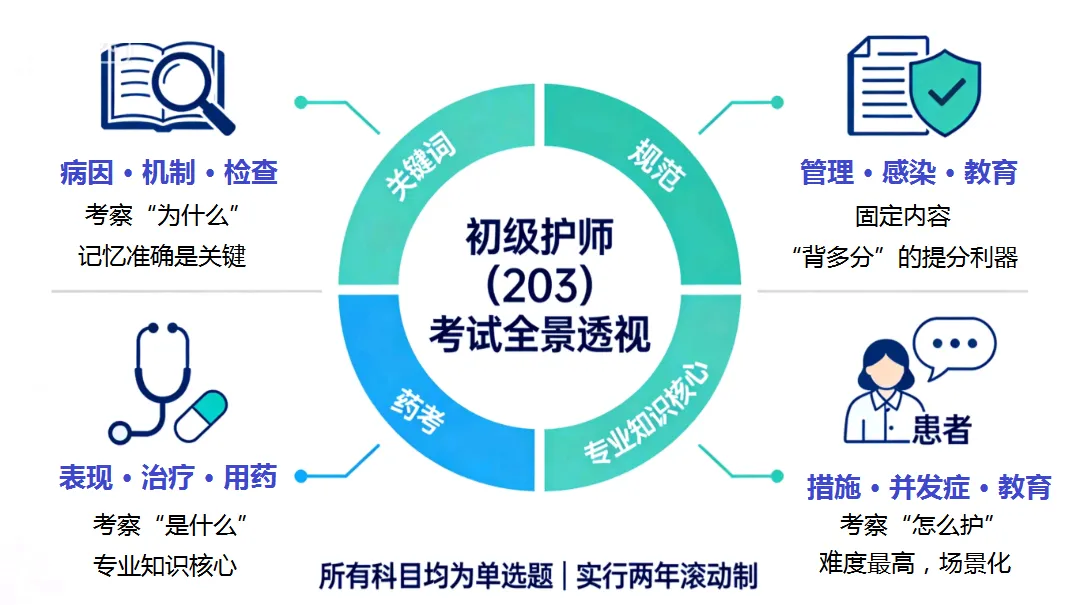 在深入细节前,我们先用一张图看清考试全貌。初级护师考试共四科,全部为单选题,但各科侧重点截然不同。
