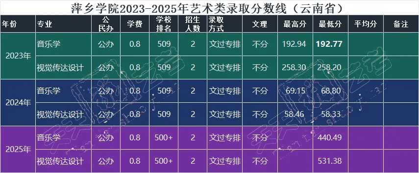 萍乡学院艺术类招生专业有广播电视编导、视觉传达设计、美术学、音乐学等专业,近年在云南招生的专业、人数和录取分数线如下:
