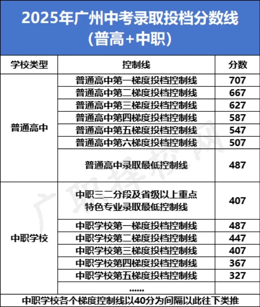2021-2025 年是广州 “新中考” 实施关键期,本汇总覆盖普通高中(含特长生、自主招生、名额分配等类别)与中职学校(含中本贯通、三二分段等项目)各批次投档分数线。期间广州实行多梯度投档录取机制,以 40 分为间隔划定普高梯度线,2025 年新增第六梯度线(507 分),普高最低控制线首次降至 500 分以下(487 分)。中职方面明确中本贯通、三二分段及重点特色专业等专项录取控制线,各批次按志愿优先原则依次投档,录取规则稳定且衔接产业人才培养需求。汇总不仅呈现五年分数线变化趋势,更清晰梳理批次设置、志愿填报要求及投档逻辑,为考生择校、家长规划提供核心参考。