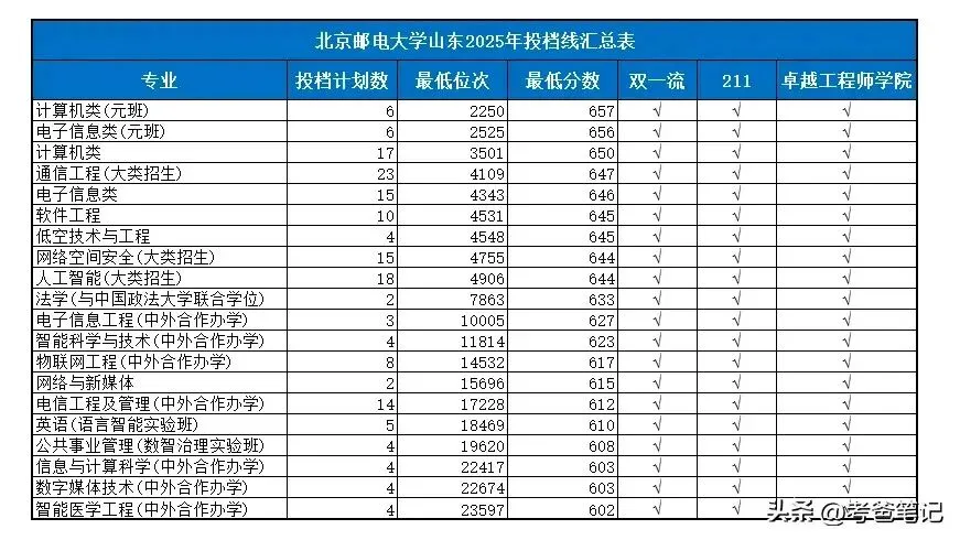 今天以山东为例,分享一下2025年北邮各专业投档分数线: