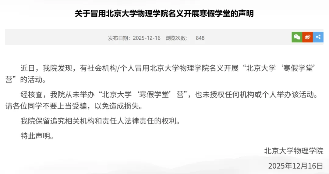 近期北京大学、清华大学等多所高校陆续发布官方声明,集中对虚假招生、违规活动进行辟谣打假。各位考生和家长一定要守住升学路上的“安全线”。(注:文末还有重磅福利,也千万不要错过了哦)2025年12月16日,北京大学物理学院发布声明称,有社会机构或个人冒用学院名义开展“北京大学‘寒假学堂’营”活动。经核查,北京大学物理学院从未举办过该活动,也未授权任何机构或个人承办此类活动。在此提醒各位同学提高警惕,切勿轻信,避免造成不必要的损失。