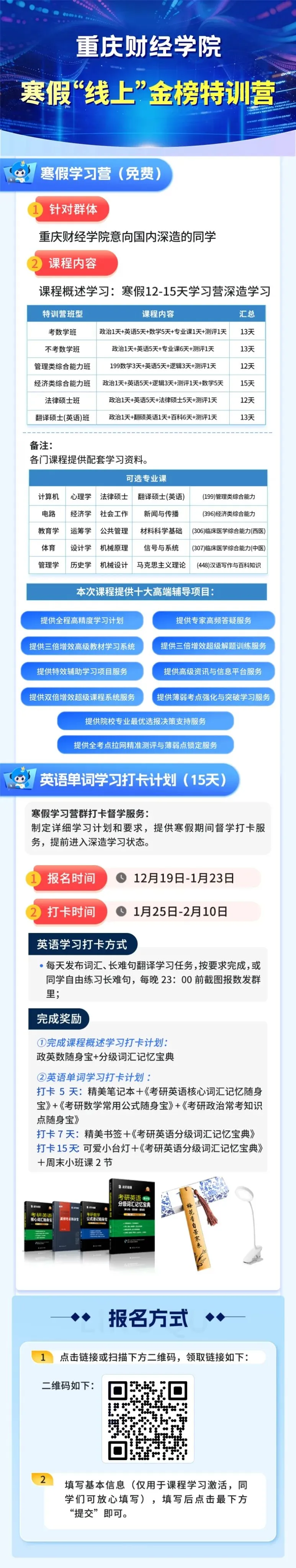 寒假期间是考研备考夯实基础、弯道超车的关键时期。为助力同学们高效备考、针对性解决考研初期备考困惑、明确复习规划,特开展寒假考研备考提升营。