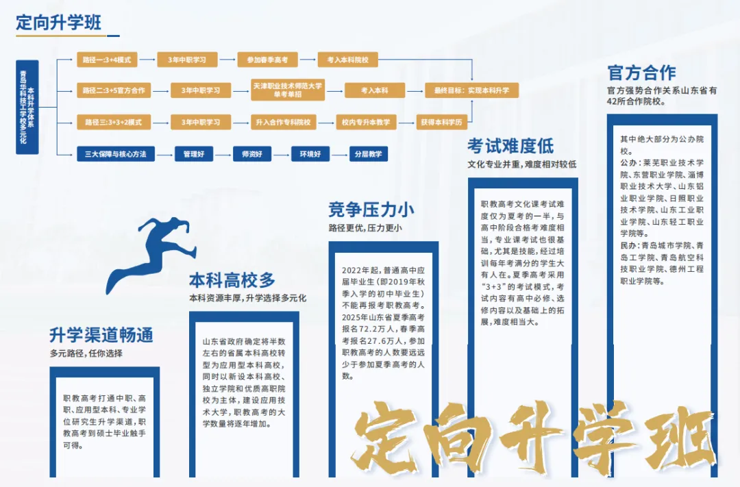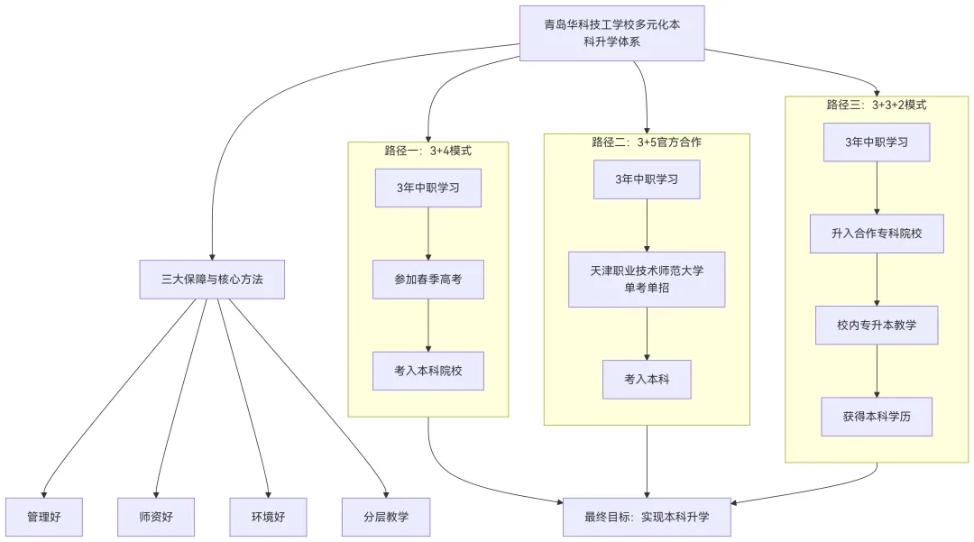 三种模式各有侧重,共同构成了青岛华科技工学校多元化的定向升学体系。学生可以根据自身情况和职业规划选择最适合的路径,实现顺利升入本科院校的目标。