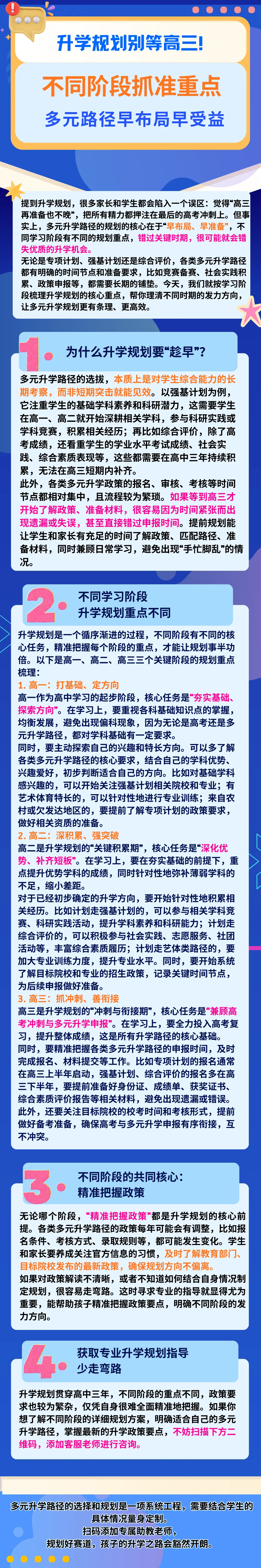 无论是专项计划、强基计划还是综合评价,各类多元升学路径都有明确的时间节点和准备要求,比如竞赛备赛、社会实践积累、政策申报等,都需要长期的铺垫。今天,我们就按学习阶段梳理升学规划的核心重点,帮你理清不同时期的发力方向,让多元升学规划更有条理、更高效。