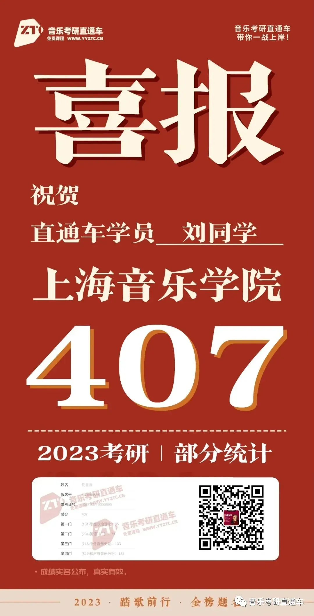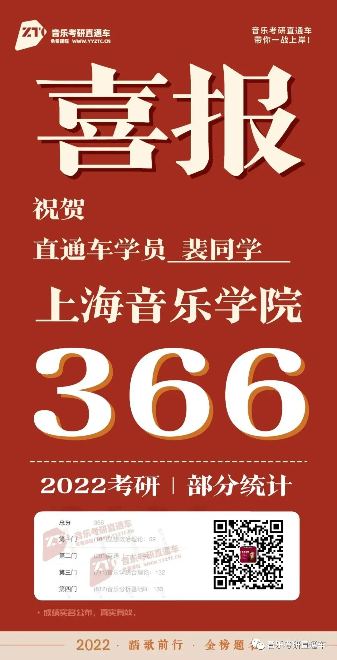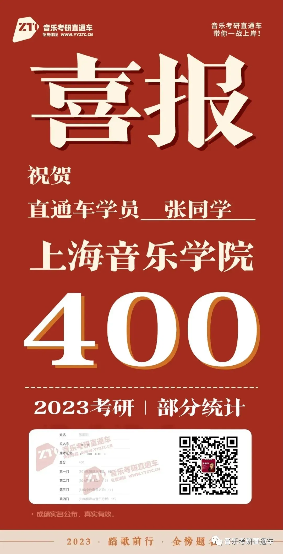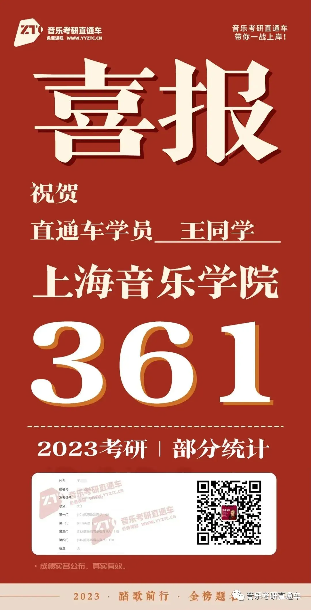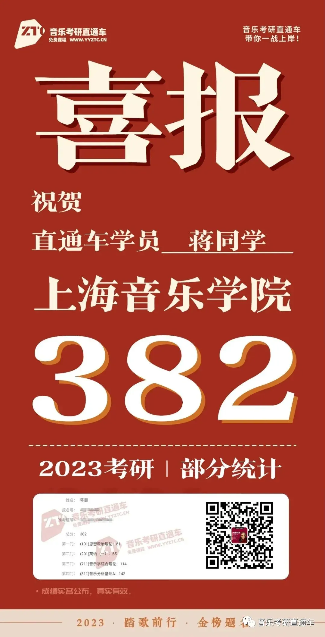 上海音乐学院,音乐考研直通车学员历年部分成绩单: