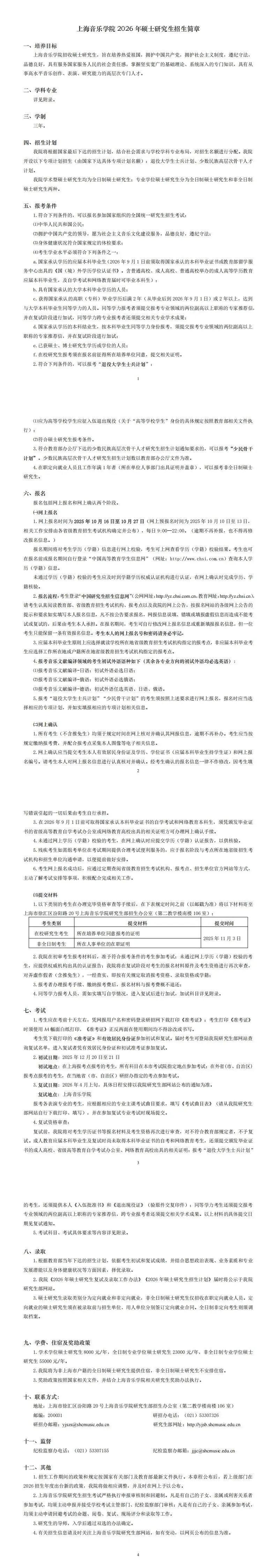 >音乐考研 | 2026年上海音乐学院硕士招生简章、专业目录、参考书