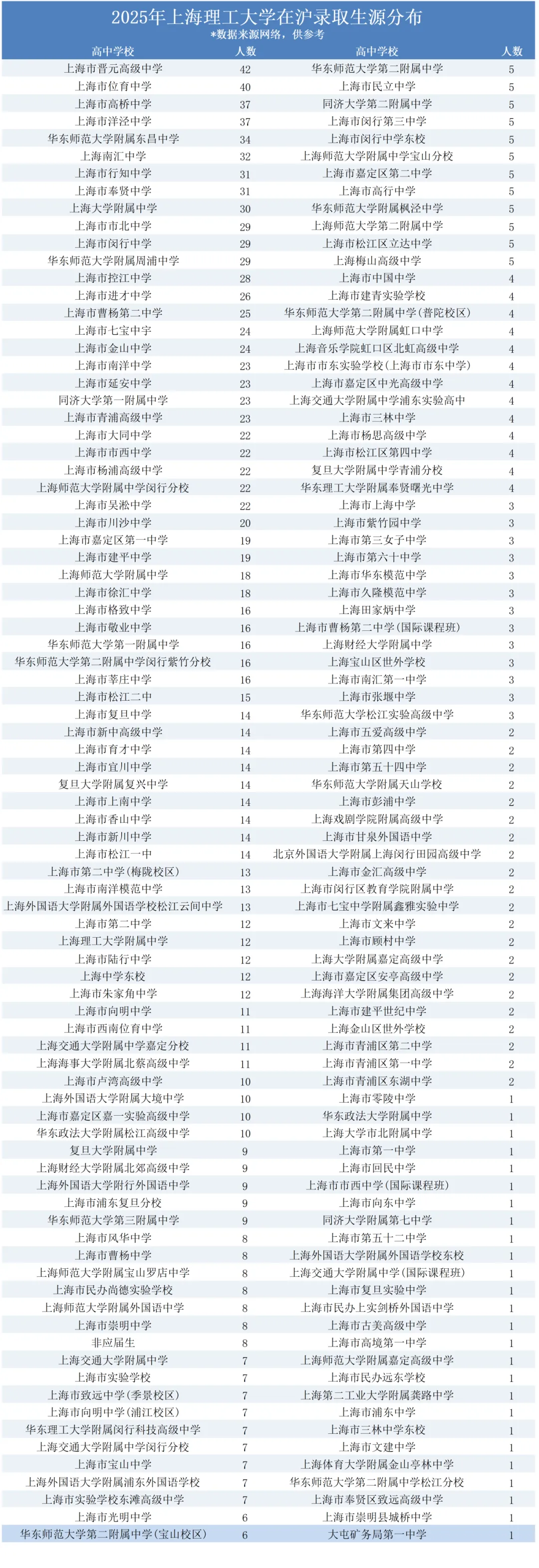 网传2025年上海理工在沪录取生源校数据新鲜出炉,从名单能清晰看出,录取人数较多的高中几乎都是全市上游市重点,这也从侧面印证了上理工的生源质量和录取门槛变化。具体分布如下: