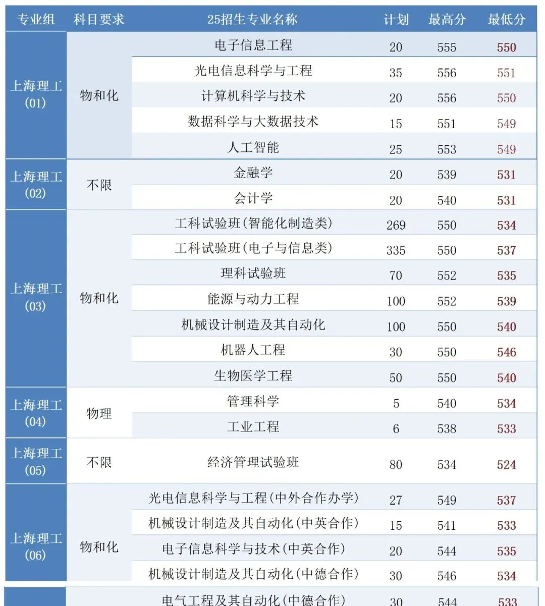 2025年上海理工普通批不限组的经管试验班最低分仅524分,但这只是“入门线”,想挤进计算机、人工智能等热门优质专业,分数得达到535分以上。具体专业分数线如下: