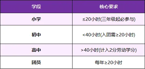 ▪️初中生:志愿服务时长<40 小时,其中入团硬性要求20小时志愿时长,成为团员后每年还需完成20小时服务。