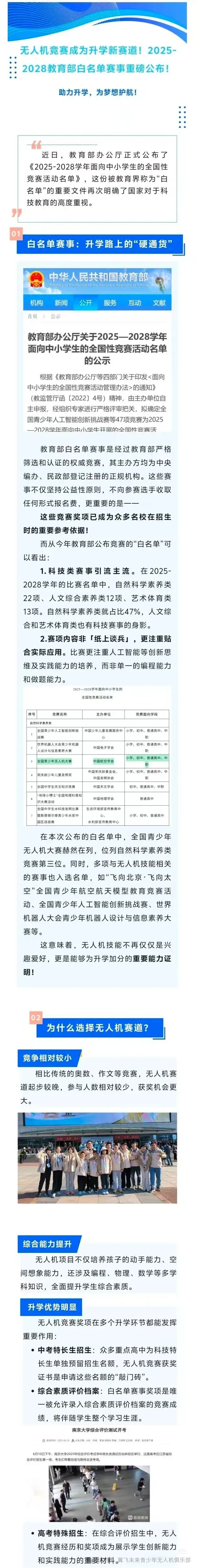当家长还在为奥数、作文竞赛的“千军万马过独木桥”发愁时,一条全新的升学赛道已悄然铺开——教育部2025-2028学年“白名单”赛事官宣,全国青少年无人机大赛正式跻身自然科学素养类竞赛前三,成为被名校招生认可的“硬通货”。