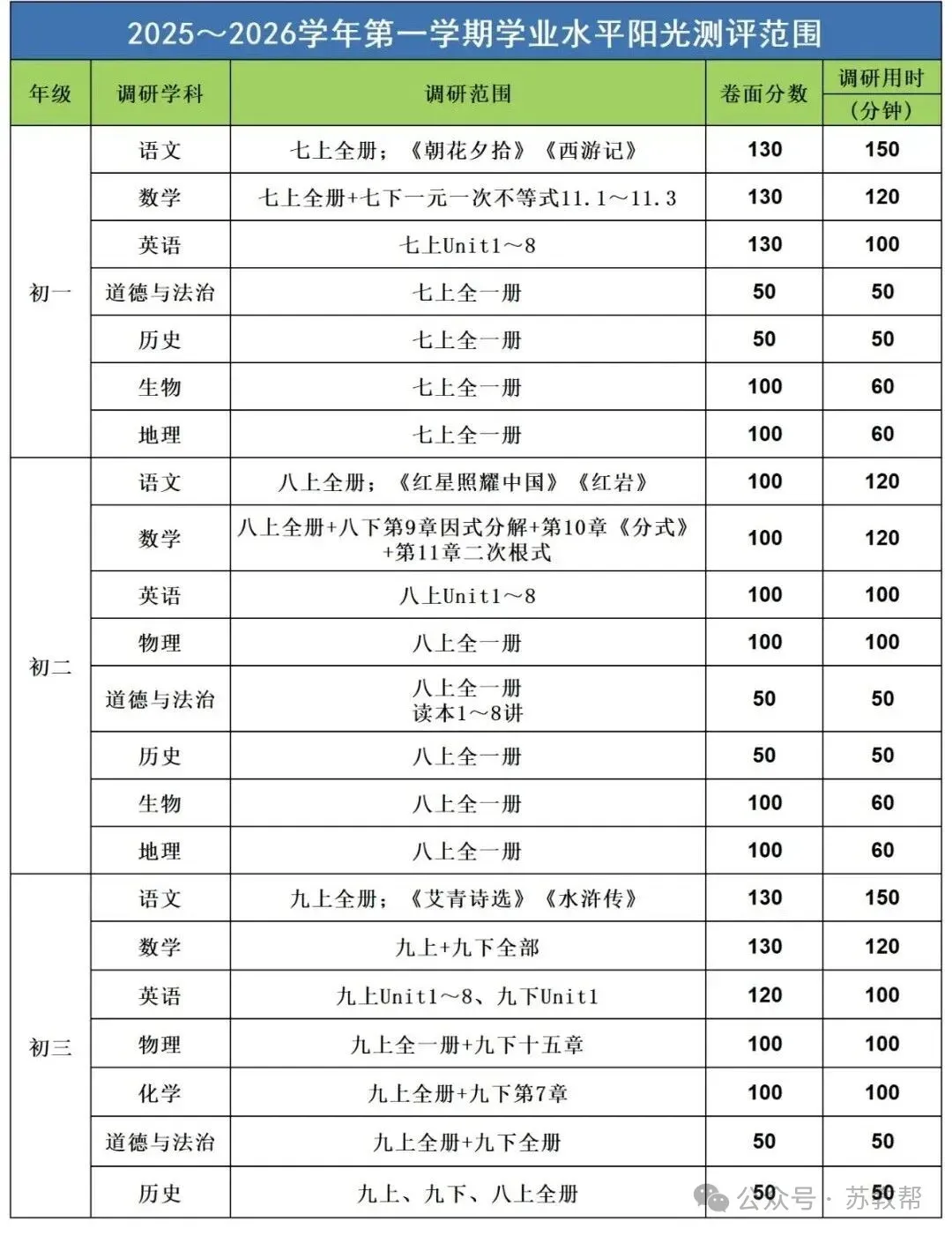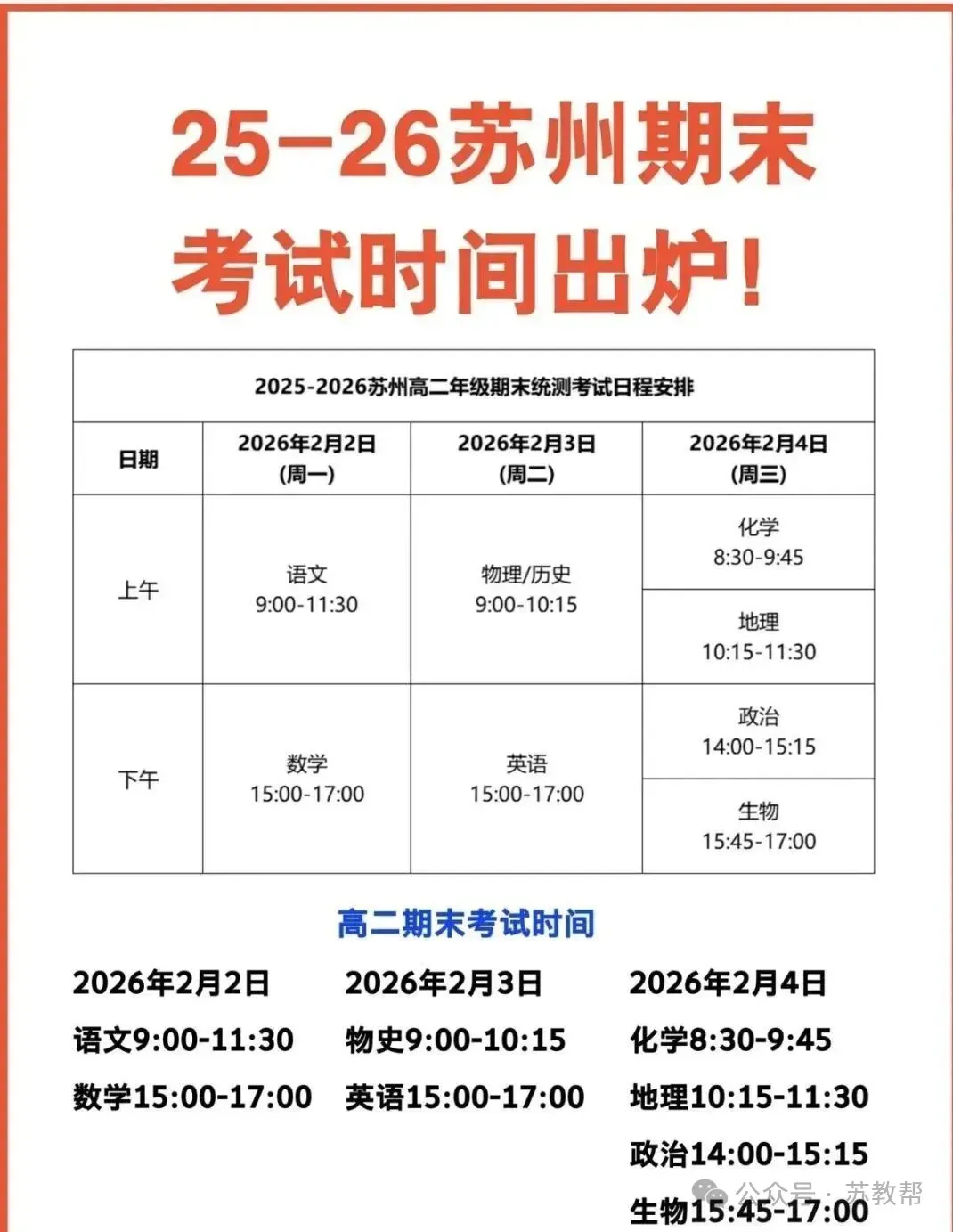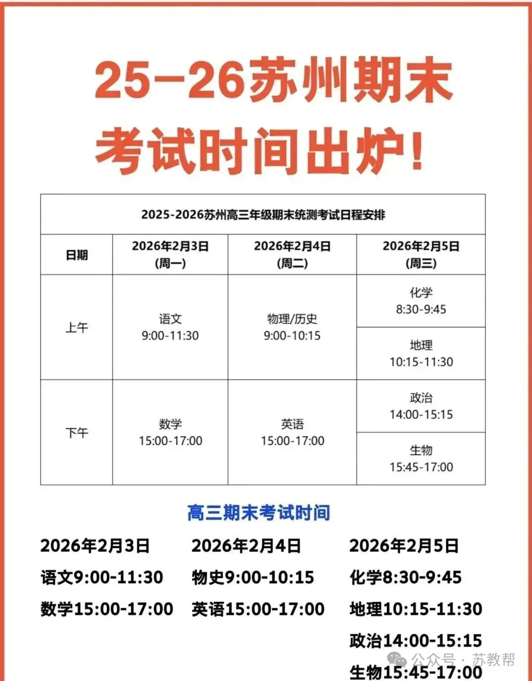 初三年级:考试时间2月2日-4日,语数外物化5科苏州六区统考;