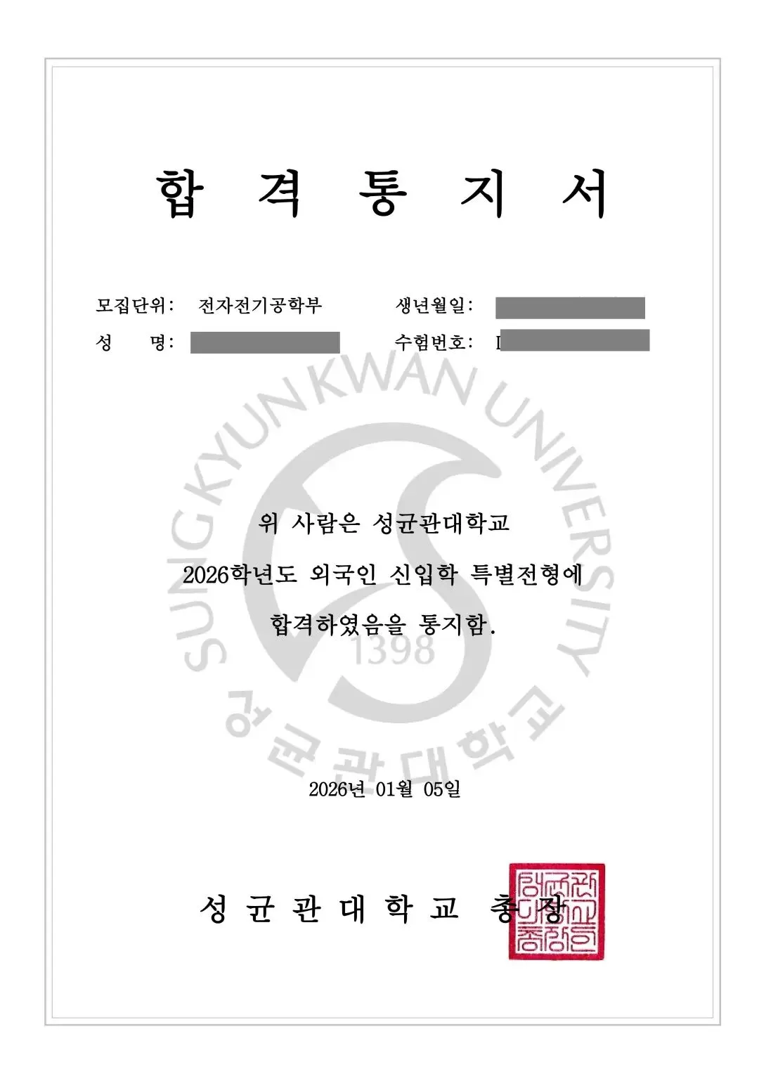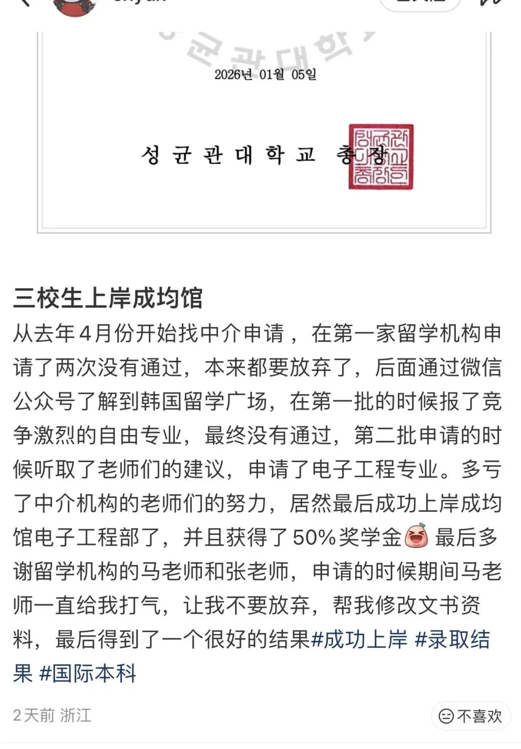 【录取喜报】热烈祝贺!成均馆大学2026年3月入学本科二批offer!