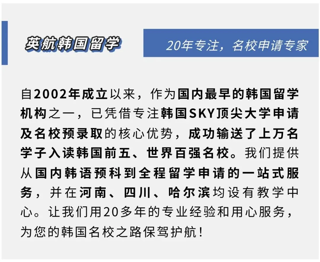 英航韩国留学凭借20年韩国高端院校申请经验,我们可以为您提供:
