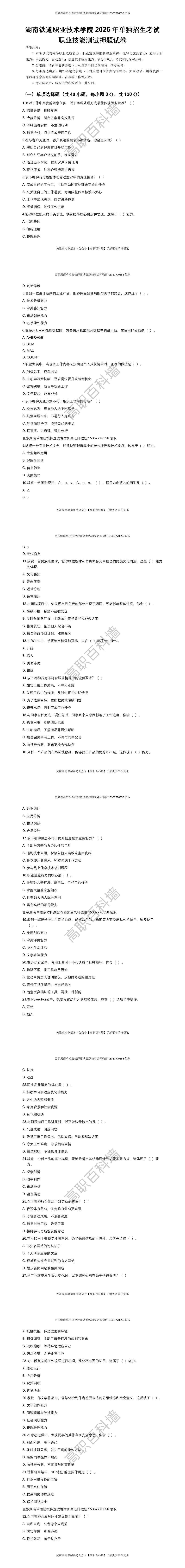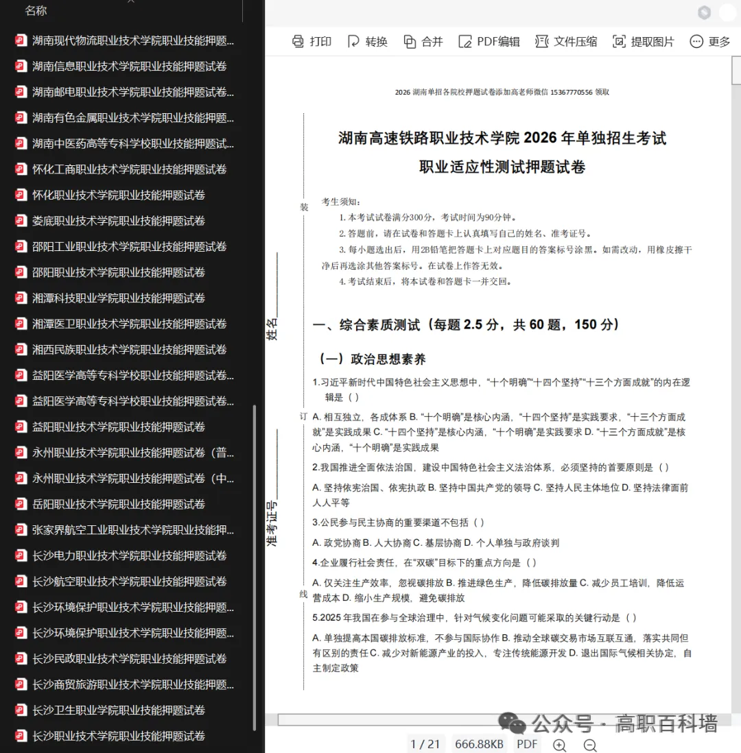 2026湖南省各院校单招押题试卷免费领取