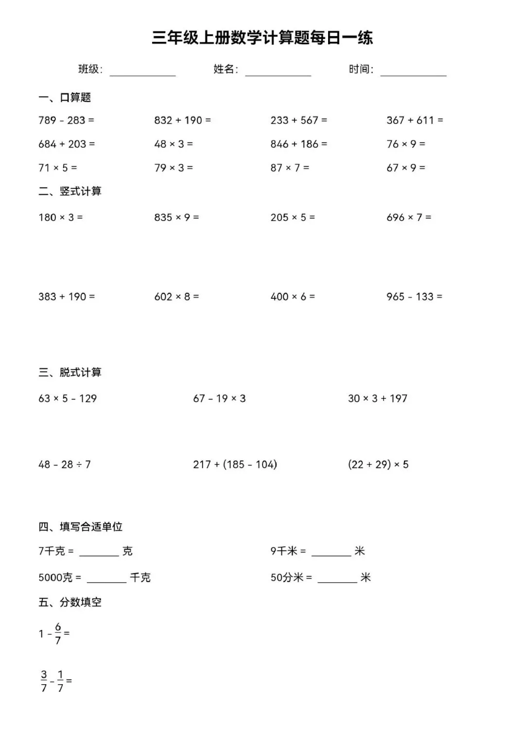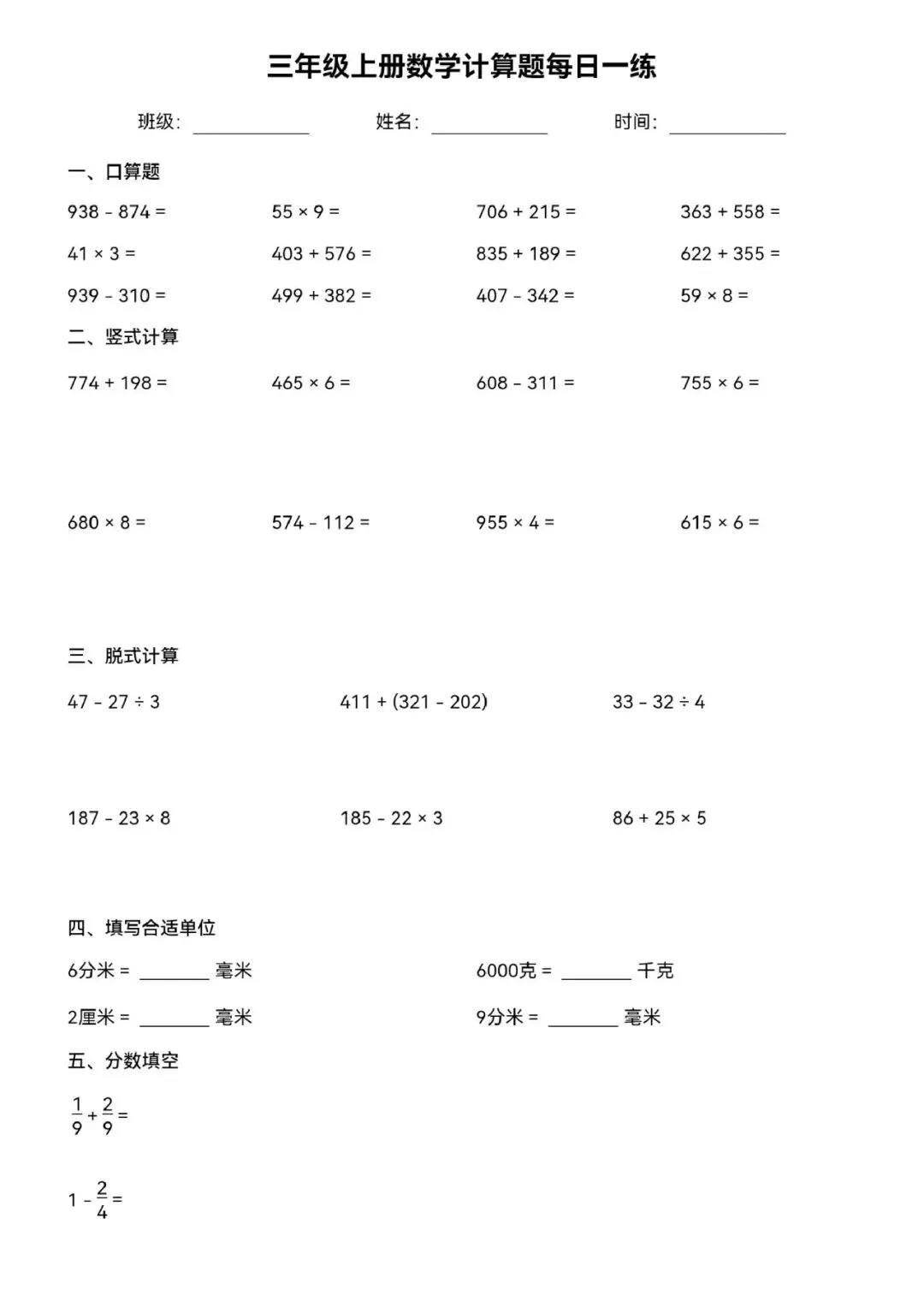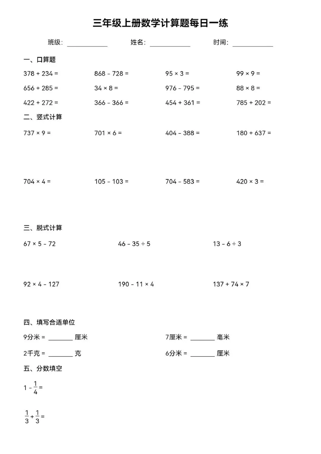 >三年级上册数学计算题每日一练期末考试老师都惊讶了