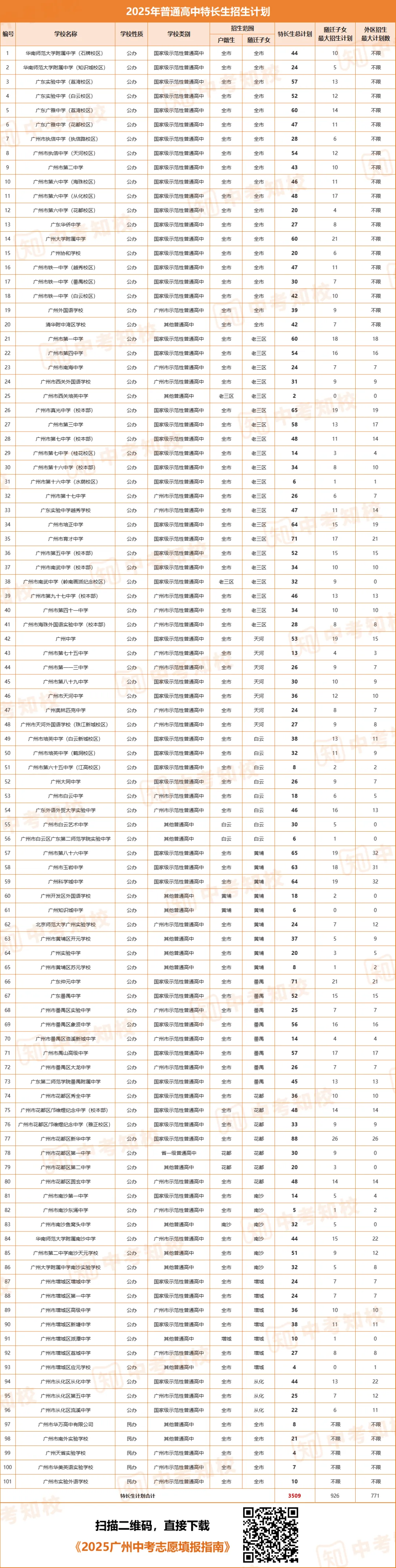 2025年广州市体育、艺术特长生招生学校有101所(含校区),招生计划共3509个。