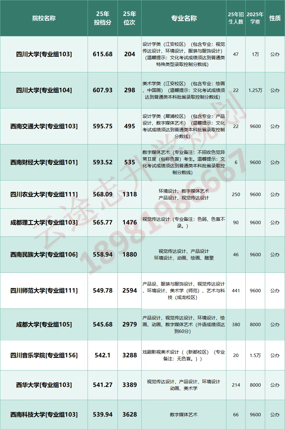 紧随其后的是 西南交通大学 和 西南财经大学。西南交大的设计学类(产品设计、数字媒体艺术)投档分为 595.75分(位次495),西南财大的数字媒体艺术为 593.52分(位次535)。这两所院校同样要求文化成绩达到普通类本科线(物理438,历史467),凸显了“强文化底蕴+优秀专业能力”的复合型人才选拔倾向。