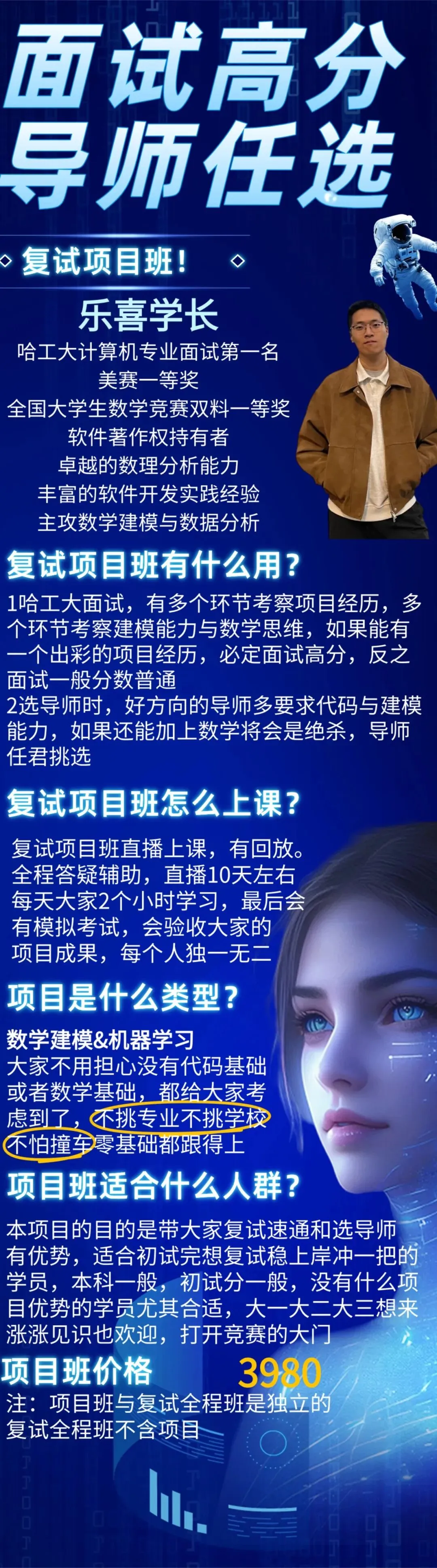 这次特意联合了哈工大计算机专业面试第一名的学长带队。一起做一个结合数学建模和机器学习的项目。该项目不要求代码基础,也不限专业,只要你肯学,就能跟得上。为期10天的突击集训。每天两小时的直播干货,足以让你在复试现场能对着老师侃侃而谈,把这个项目变成你简历上的亮点,给导师一个录取的理由!
