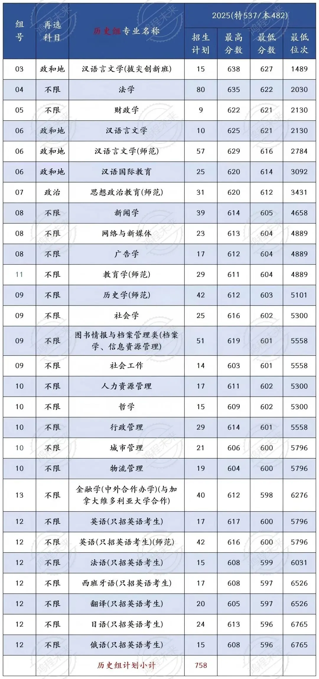 选考历史,录取分最低的是日语和俄语,分数是596分。选考历史,专业录取分最高的是汉语言文学(拔尖创新班),分数是638分。
