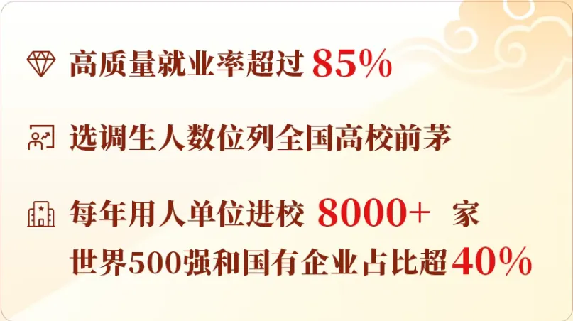 (3)发展前景:本科生近三年平均就业率超95%,毕业生可进入国有企业、政府机关、企业等单位就职;国内外深造率近40%,毕业生多赴北京大学、清华大学、耶鲁大学、牛津大学等国内外知名大学深造。