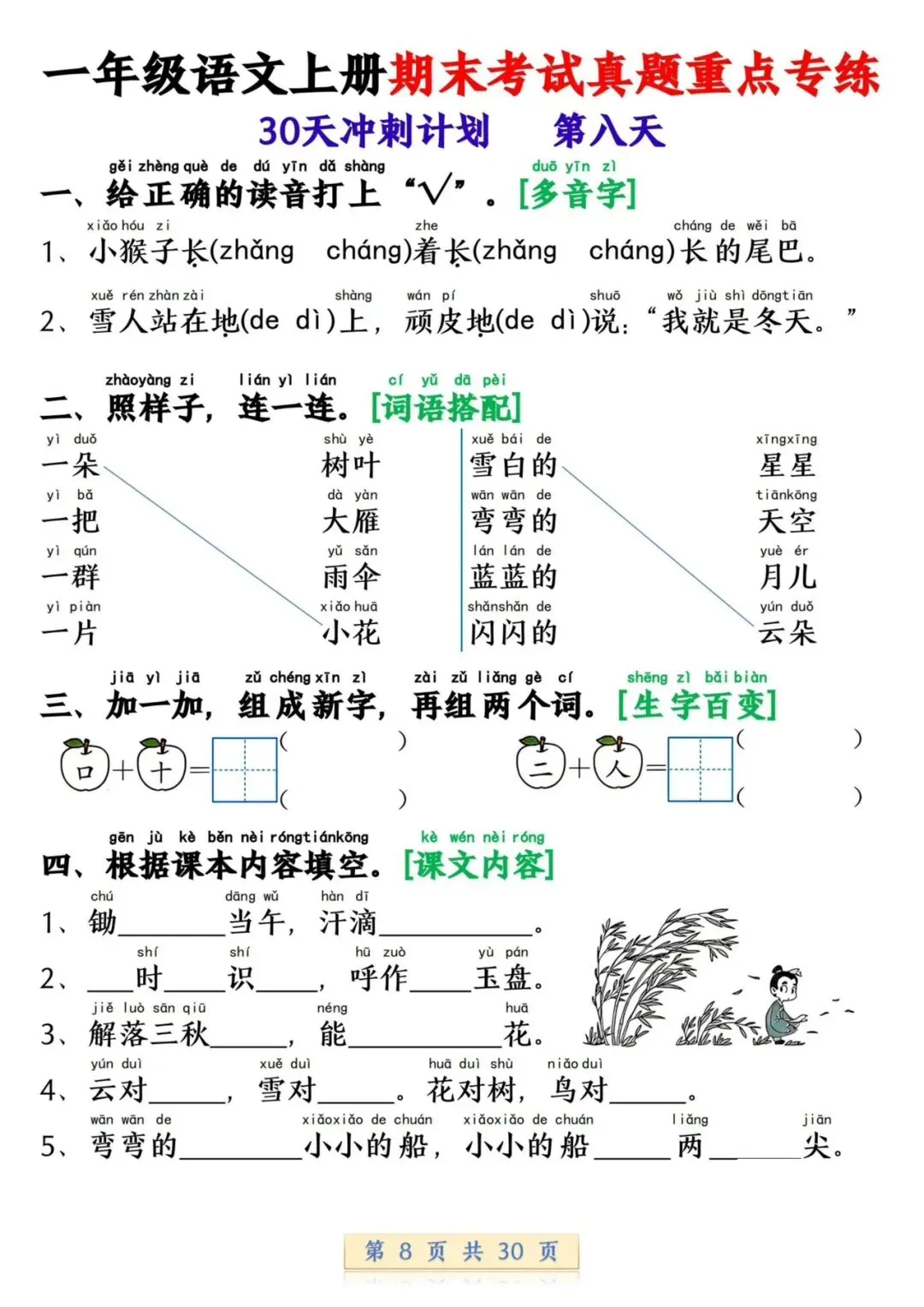 一年级上册语文【期末考试真题重点专练(30天冲刺计划)】,可打印电子版