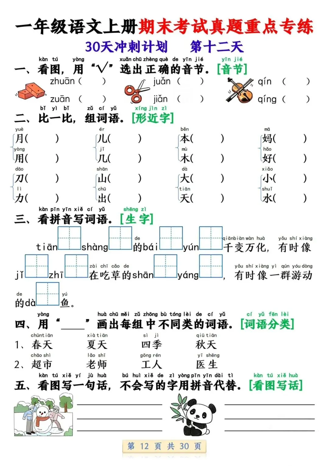 一年级上册语文【期末考试真题重点专练(30天冲刺计划)】,可打印电子版这份练习有汉语拼音,字词,看拼音写词语,课文内容,拼音,生字,看图写词语,古诗词背记默写,笔画笔顺等,帮忙重难点集中突破,帮助孩子夯实基础,提升能力,需要的赶紧打印出来给孩子练一练吧。领取完整电子版: