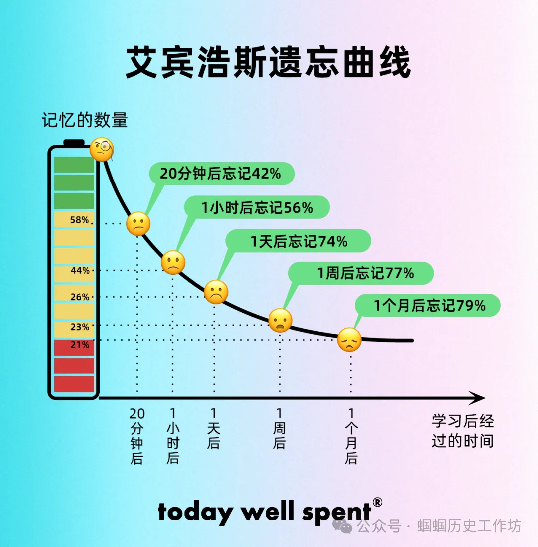 根据艾宾浩斯遗忘曲线,人的遗忘是有规律的,因此需要定期对所学的历史知识进行复习,强化记忆。可以制定一个复习计划,按照不同的时间间隔,如当天复习、一周后复习、一个月后复习等,对知识点进行反复记忆,以达到长期记忆的效果。
