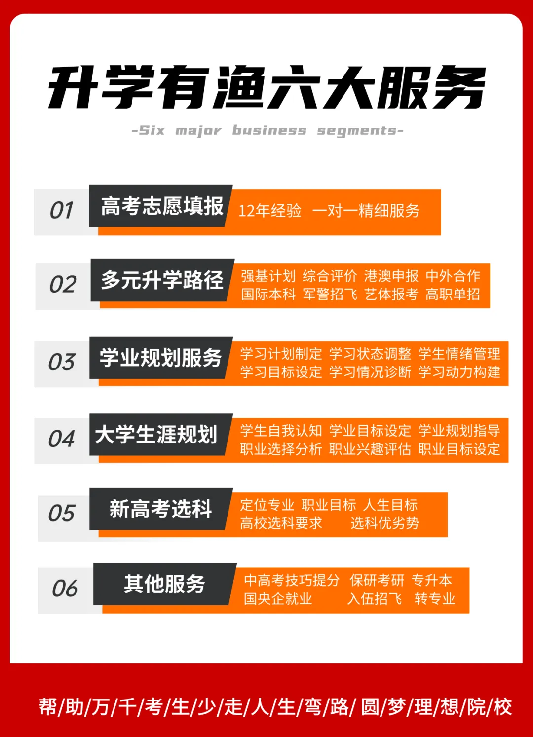 升学有渔创立于2013年,是一家专注于初高中学习力提升、多元规划、专业志愿填报以及大学生涯规划的教育咨询讯公司。我们怀抱教育者初心,致力于帮助青少年提升学习动力、调整学习状态、优化学习方法、明确未来职业发展方向,并量身定制多元化升学路径、顺利进入理想大学,并最终实现职业成功。