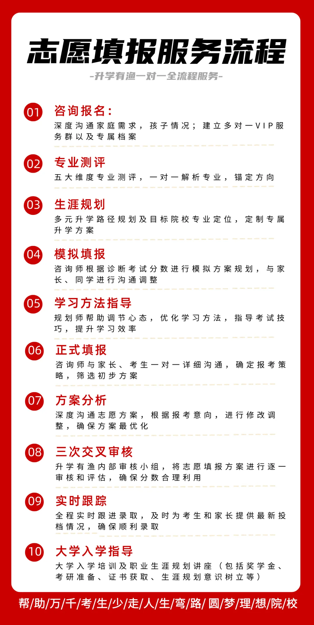决胜高考,不仅是分数,更是选择!升学有渔凭借在升学规划领域的深厚积淀,由多年一线报考经验的资深专家领衔,成为您身边的专业智囊团,确保为您提供的每一个建议都经过数据与实战的淬炼,提供超越填报的全程护航体系,一套科学、系统、贯穿始终的生涯规划解决方案。