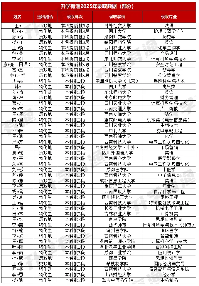 2025 年四川新高考 “院校专业组” 模式下,升学有渔服务的所有考生 100% 无滑档,从高线临界生到中线保底生均未因志愿梯度失衡、限制条件疏漏退档;同时达成 100% 无调剂,所有考生均被填报的目标专业录取,且平均录取分数与专业投档线差值≤5 分,最低压线0分录取,用精准规划让每一分都发挥价值。升学有渔 13 年扎根四川志愿填报,累计收获数千家长真实好评,本土服务的专业与贴心,成为家长口口相传的升学保障!