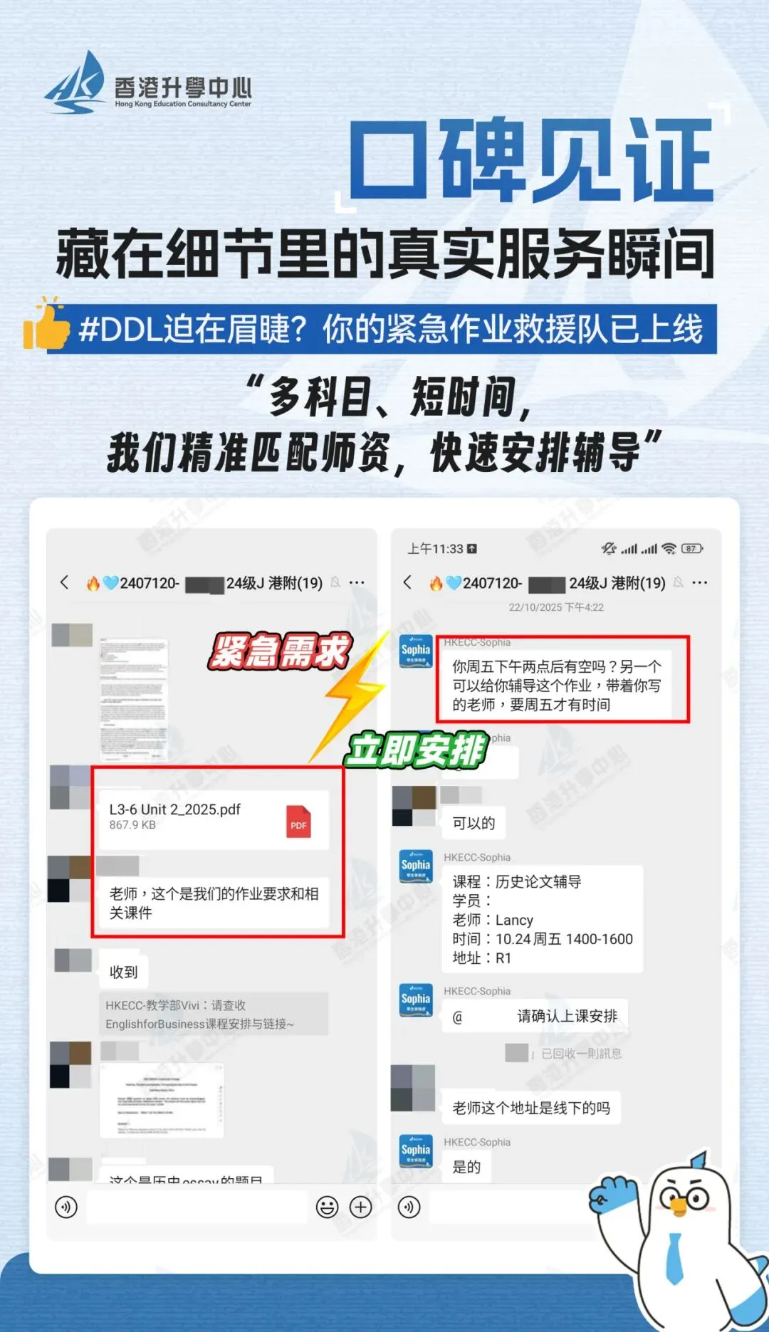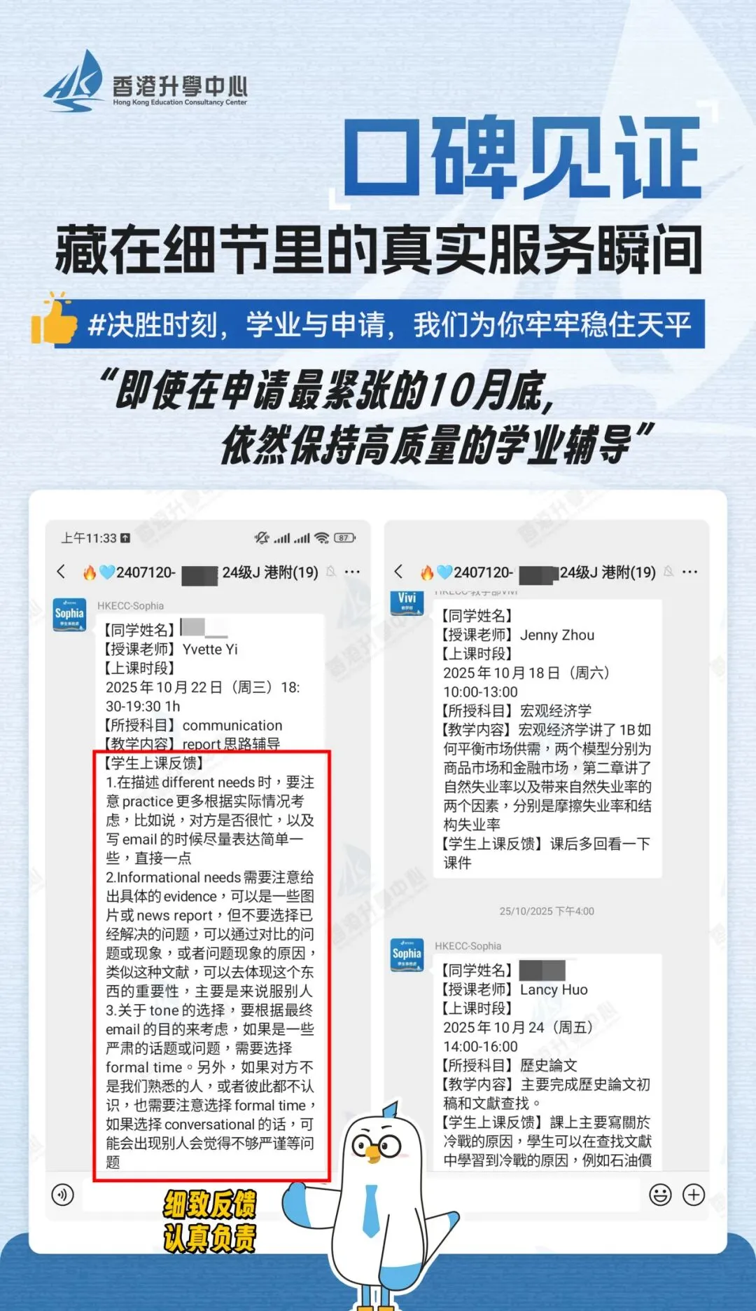 • 建立期末、期中约谈关怀机制,学业导师一对一与学生沟通学习情况,及时发现问题并调整学习计划;生活顾问随时响应学生的生活难题,从租房建议到证件办理,做学生在香港的“贴心后盾”。在期中、期末的关键节点,开展专属约谈关怀,针对性疏解学业压力;考前组织集中答疑,扫清知识盲区,助你始终怀揣从容自信的心态,应对每一场考试。