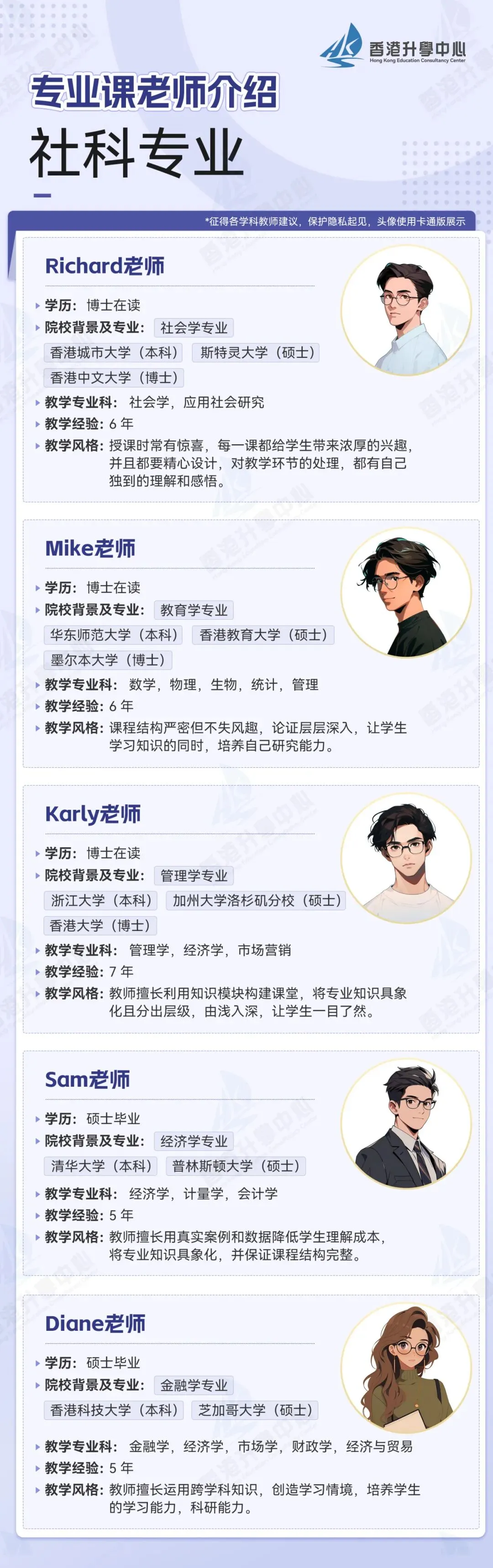 • 组建由香港高校毕业讲师、资深升学顾问构成的师资天团,所有老师均具备港校或海外名校深造背景,兼具丰富教学经验与港校学术认知,躬身授课。